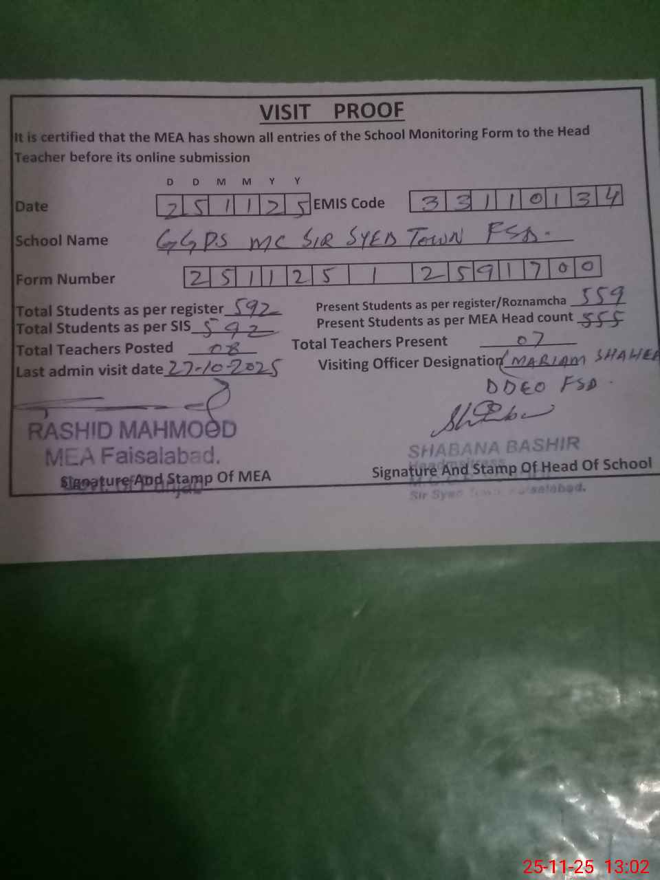 | Attendance Register | Head Teacher | MEA with School | Visit Proof |