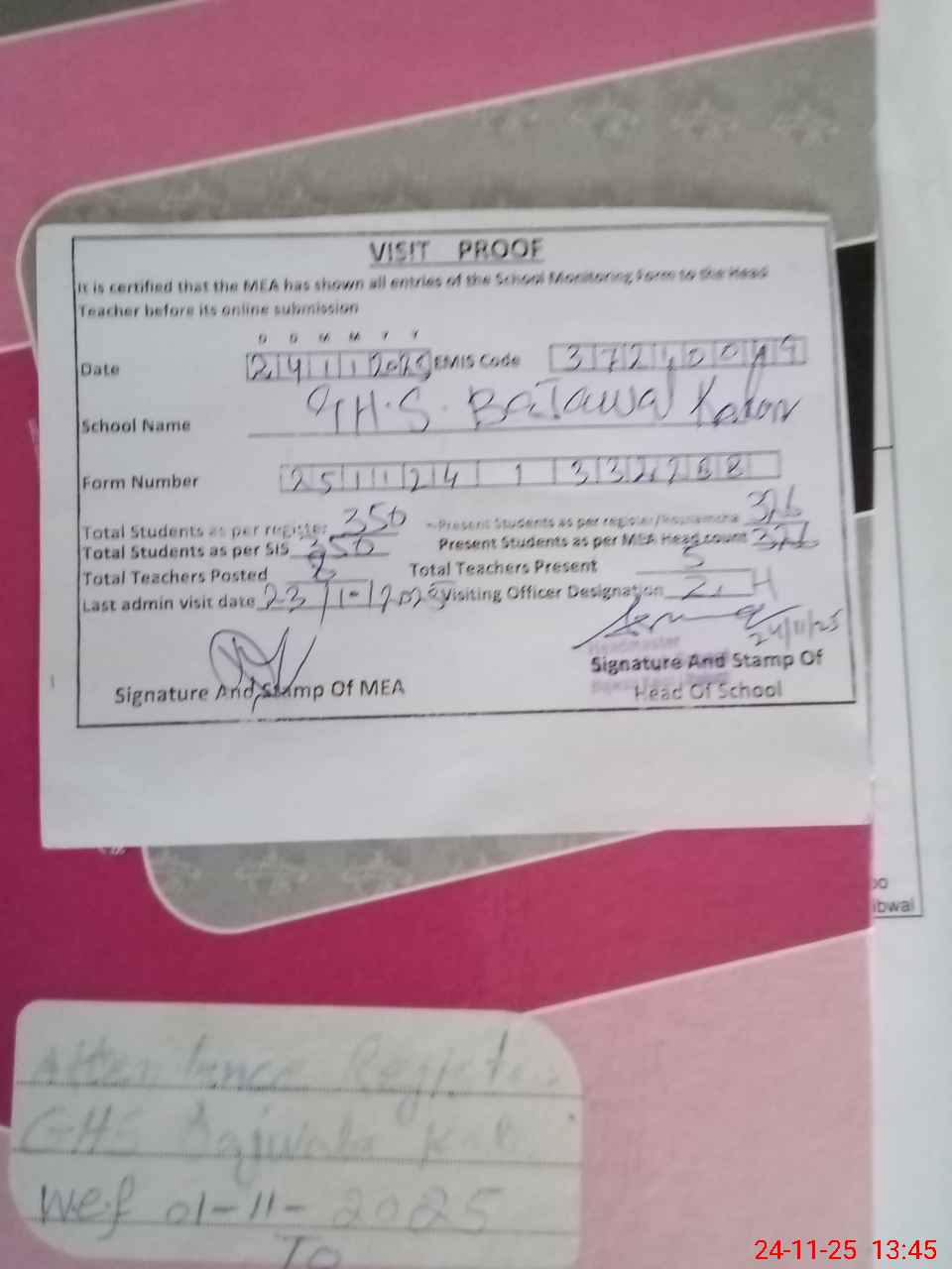 | Attendance Register | Head Teacher | MEA with School | Visit Proof |