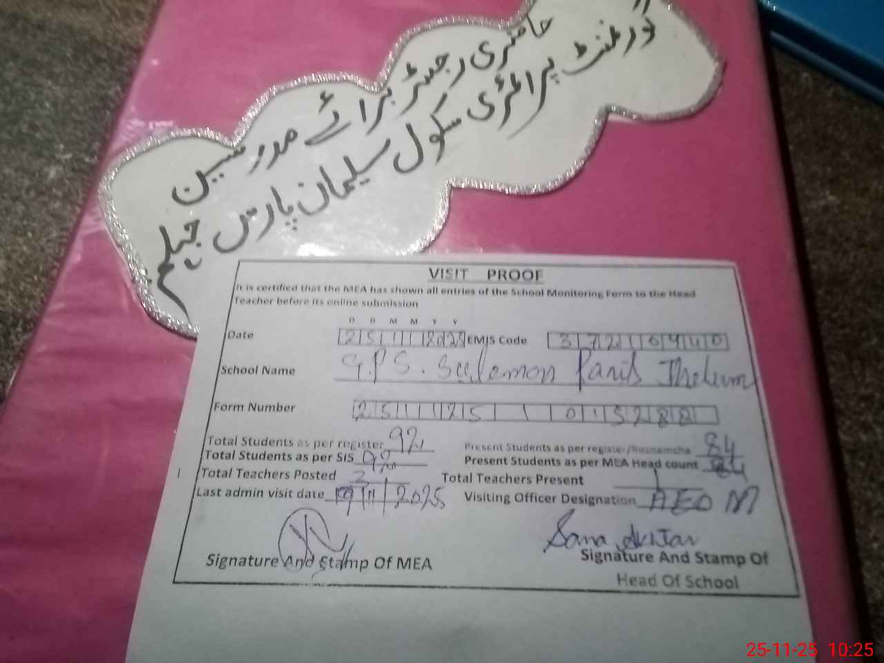 | EMIS Code: 37210440 | Name of School: GPS SULEMAN PARIS JHELUM | |||