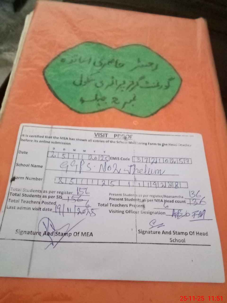 | Attendance Register | Head Teacher | MEA with School | Visit Proof |