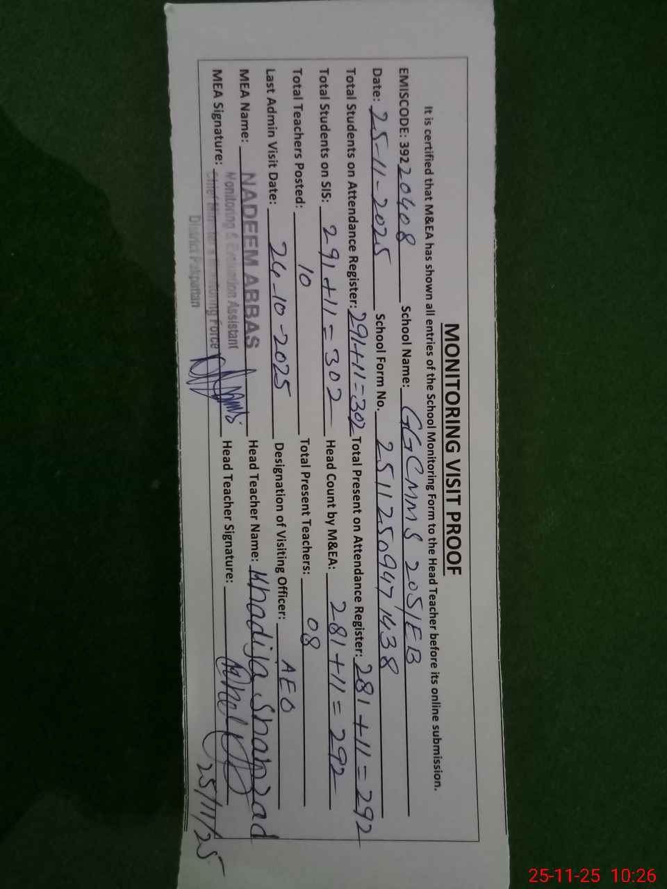 | Certified that this School was Inspected by the Undersigned MEA/DMO Today and the Information Stated Above is as Per Record. | |||||
