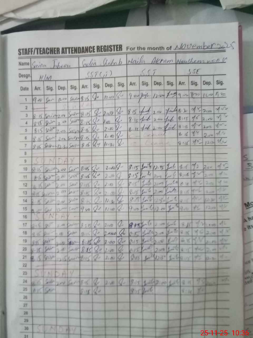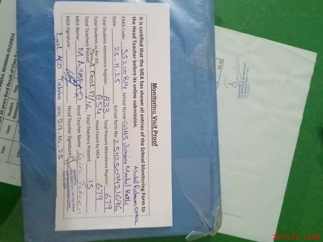 | Remarks (Use Separate Page if Required): Teachers Sanctioned Post 17 and Filled 16 AEO Tahira last visit on 29-10-25 35210814 | |||||
