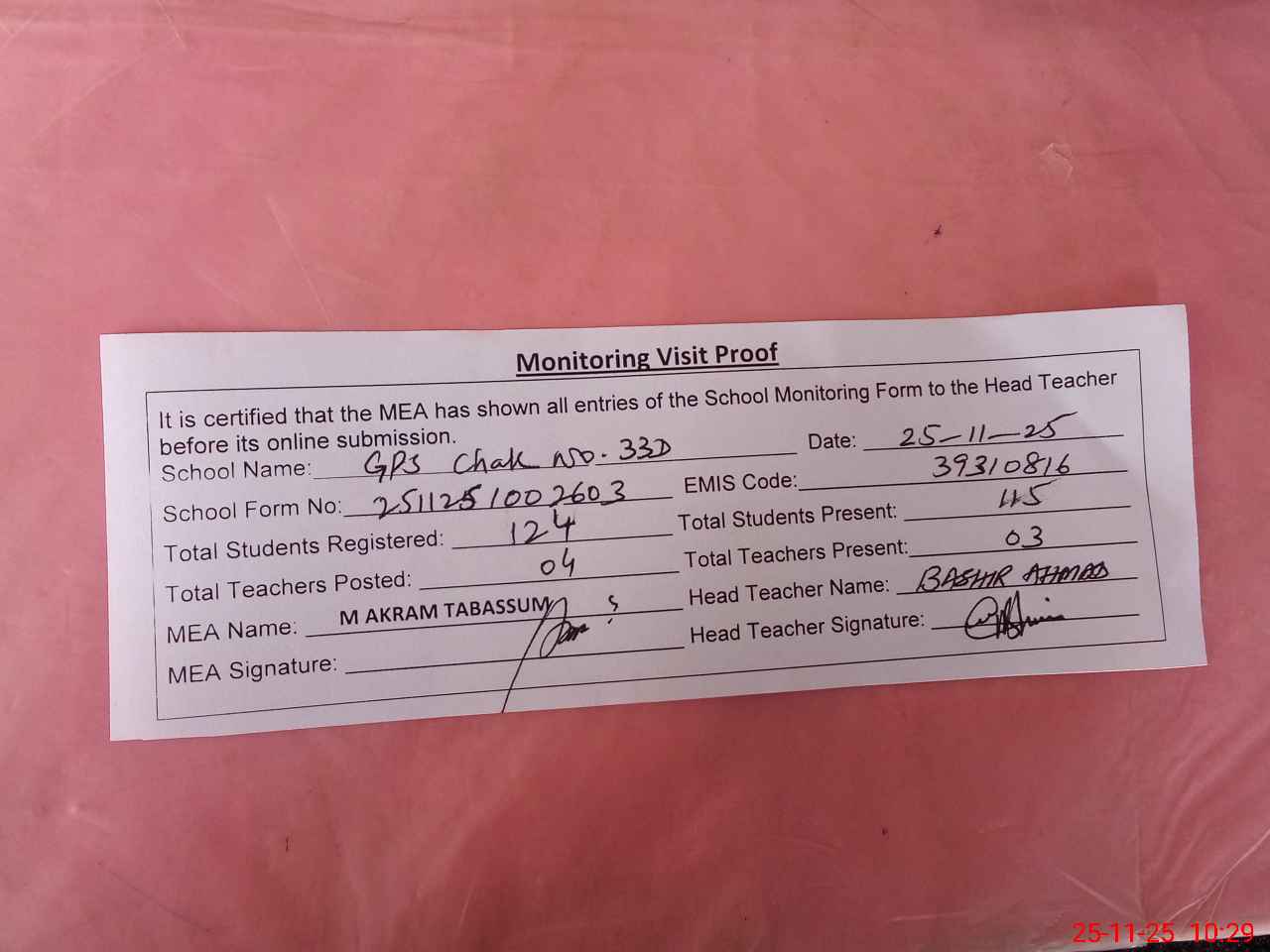| EMIS Code: 39310816 | Name of School: GPS CHAK NO. 33-D | |||