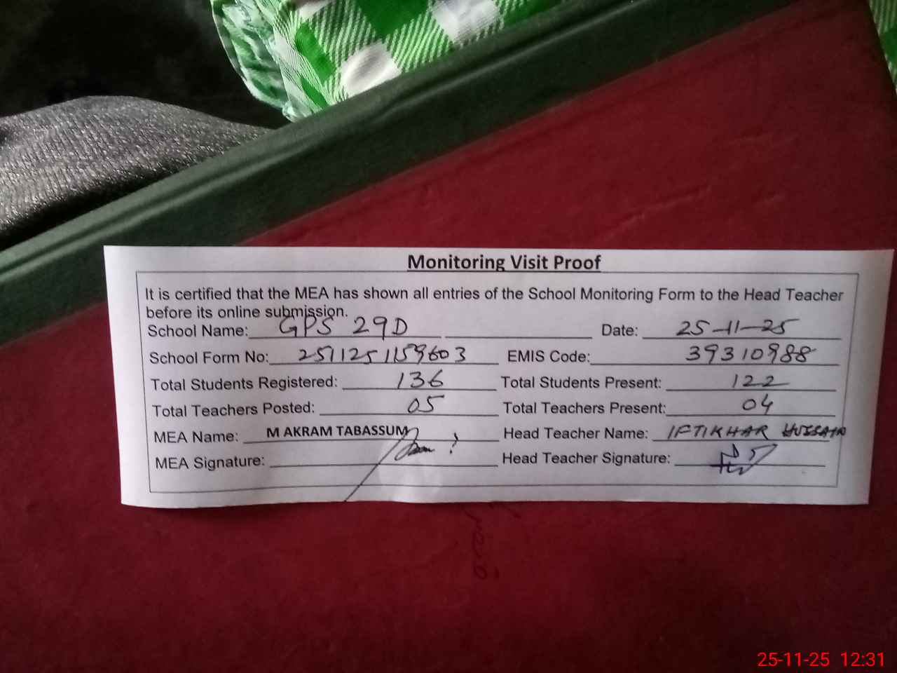 | Attendance Register | Head Teacher | MEA with School | Visit Proof |