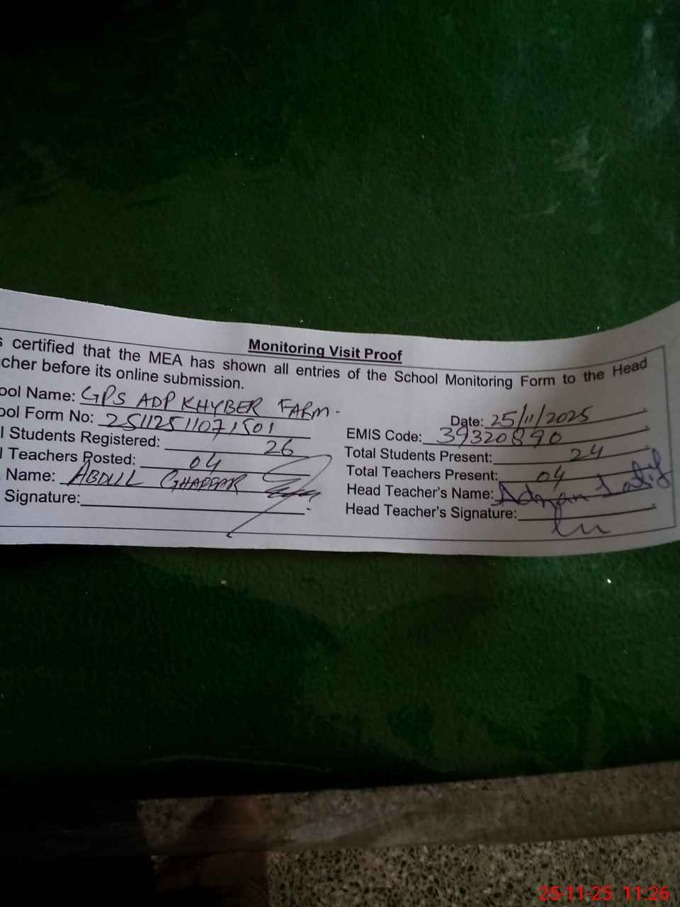 | EMIS Code: 39320890 | Name of School: GPS ADP KHYBER FARM | |||