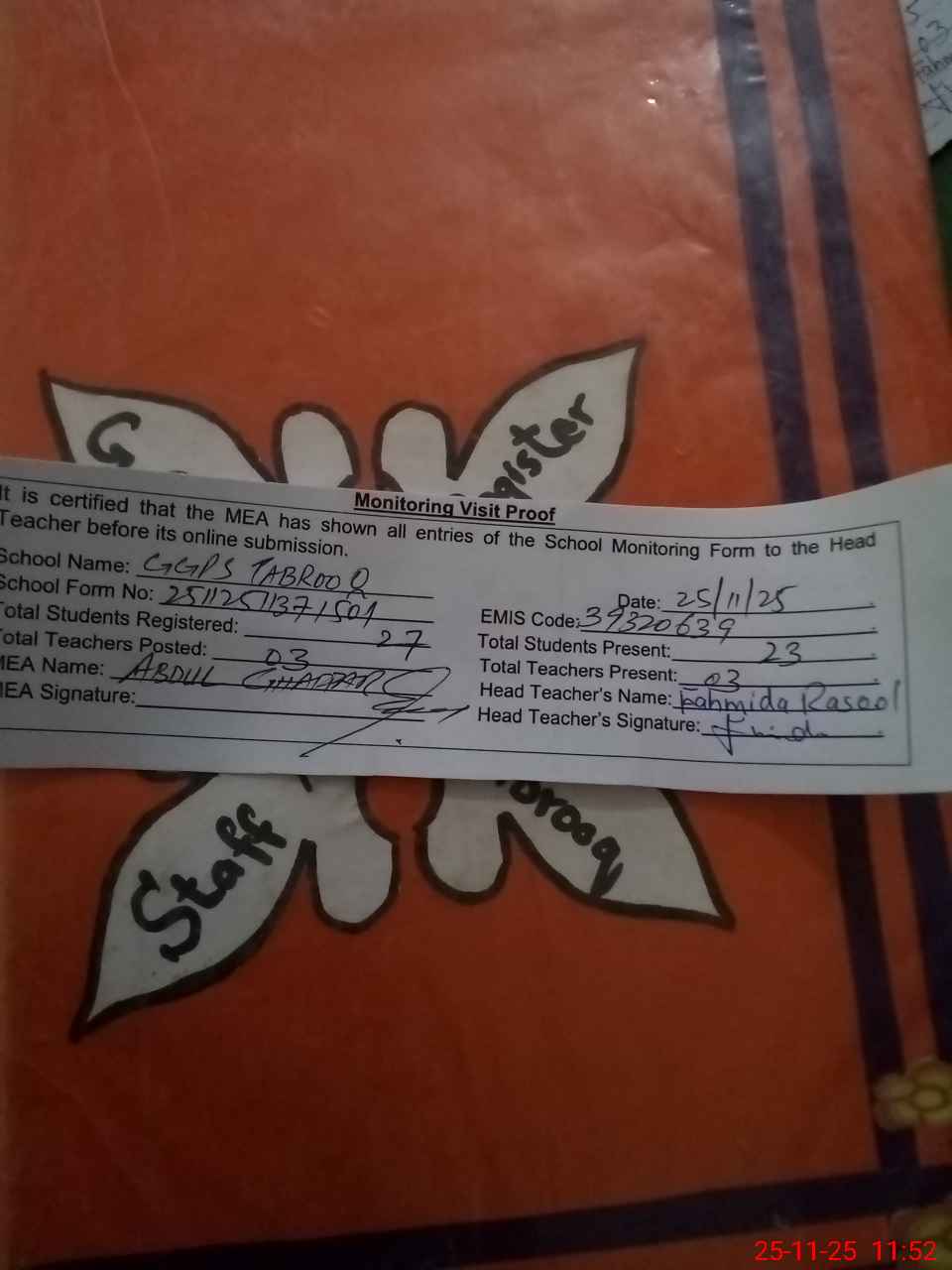 | Attendance Register | Head Teacher | MEA with School | Visit Proof |