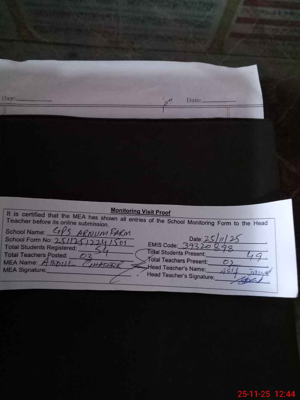 | Attendance Register | Head Teacher | MEA with School | Visit Proof |