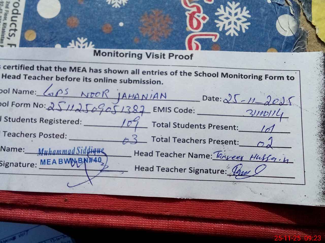 | EMIS Code: 31110114 | Name of School: GPS NOOR JAHANIAN | |||