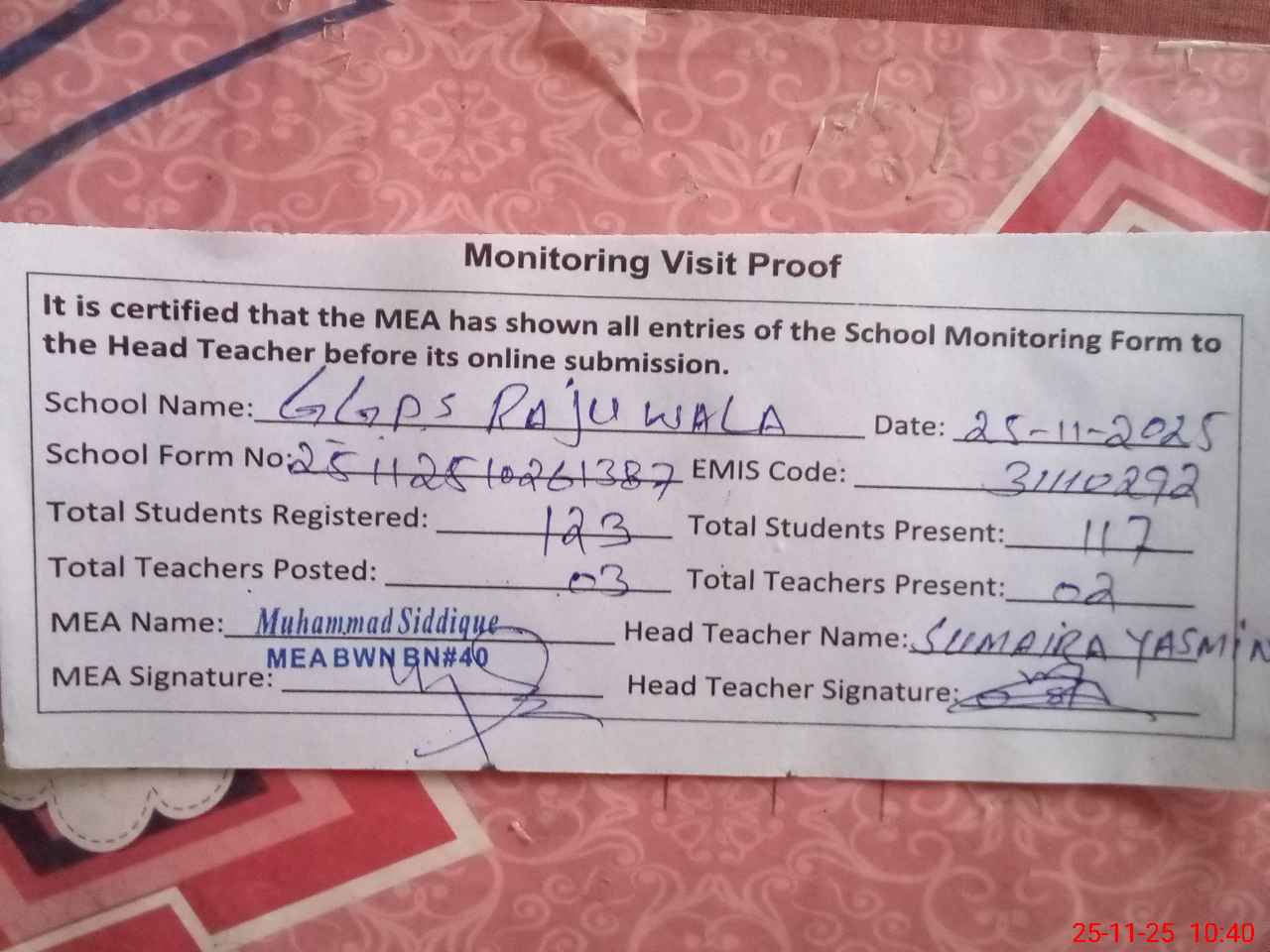 | EMIS Code: 31110292 | Name of School: GGPS RAJU WALA | |||