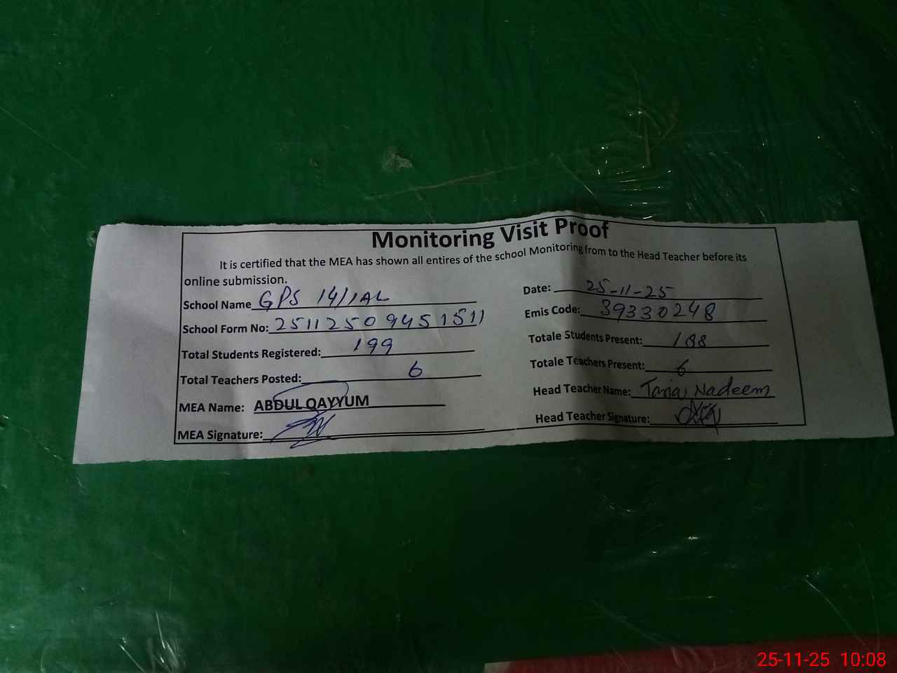 | Attendance Register | Head Teacher | MEA with School | Visit Proof |