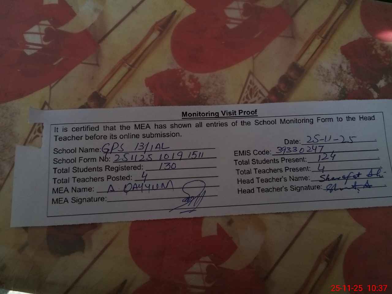 | Attendance Register | Head Teacher | MEA with School | Visit Proof |