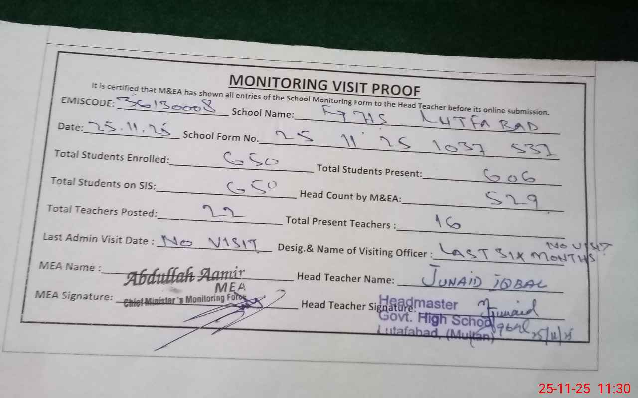 | Certified that this School was Inspected by the Undersigned MEA/DMO Today and the Information Stated Above is as Per Record. | |||||