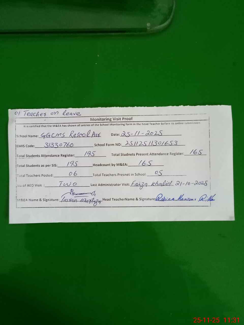 | Attendance Register | Head Teacher | MEA with School | Visit Proof |