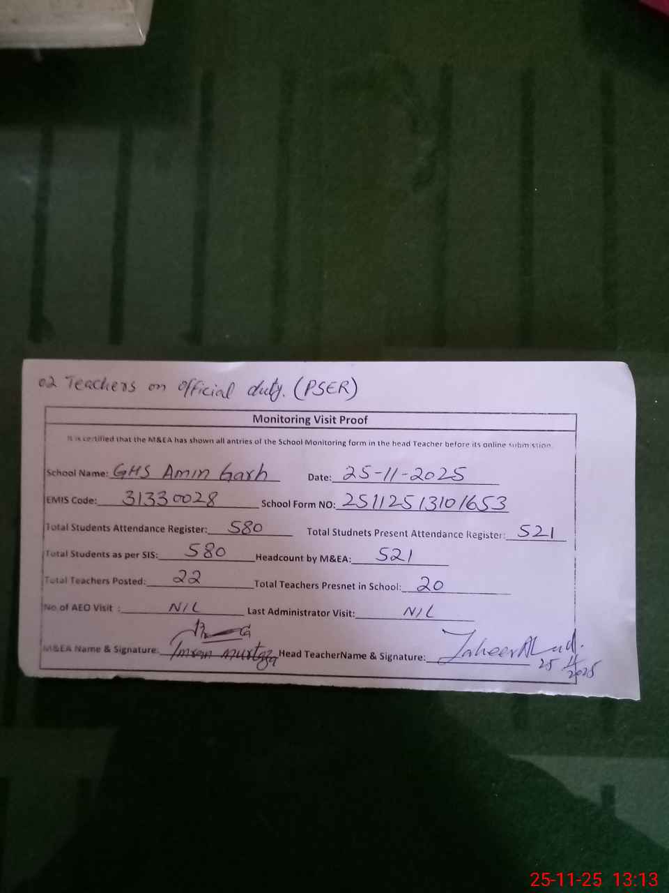 | Attendance Register | Head Teacher | MEA with School | Visit Proof |