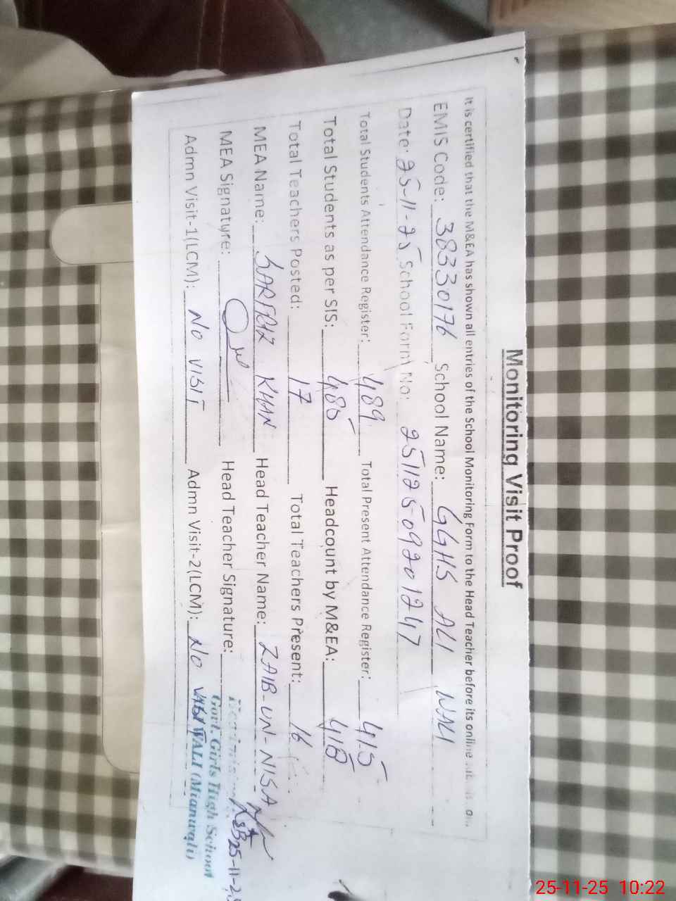 | Attendance Register | Head Teacher | MEA with School | Visit Proof |