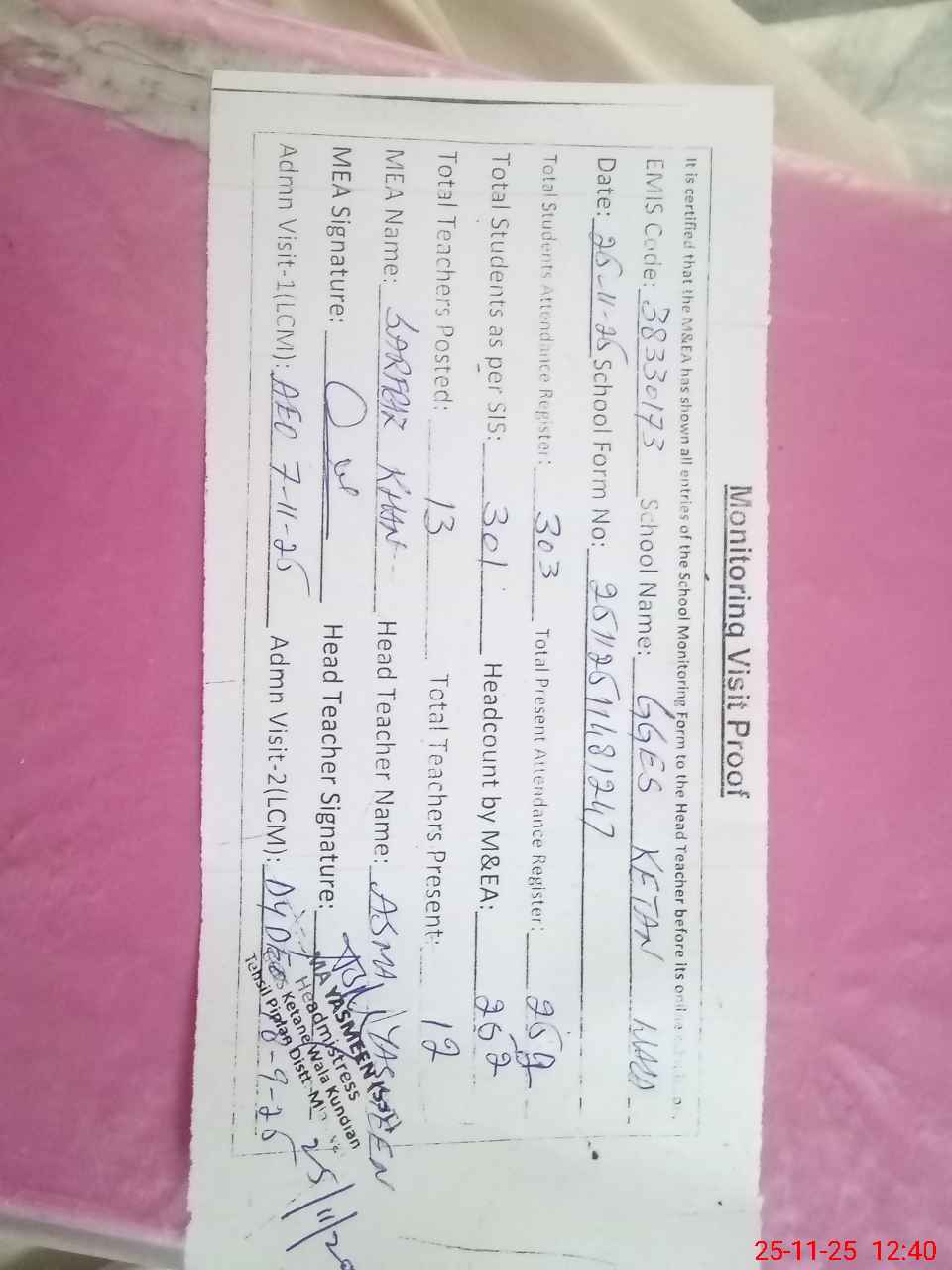 | Attendance Register | Head Teacher | MEA with School | Visit Proof |