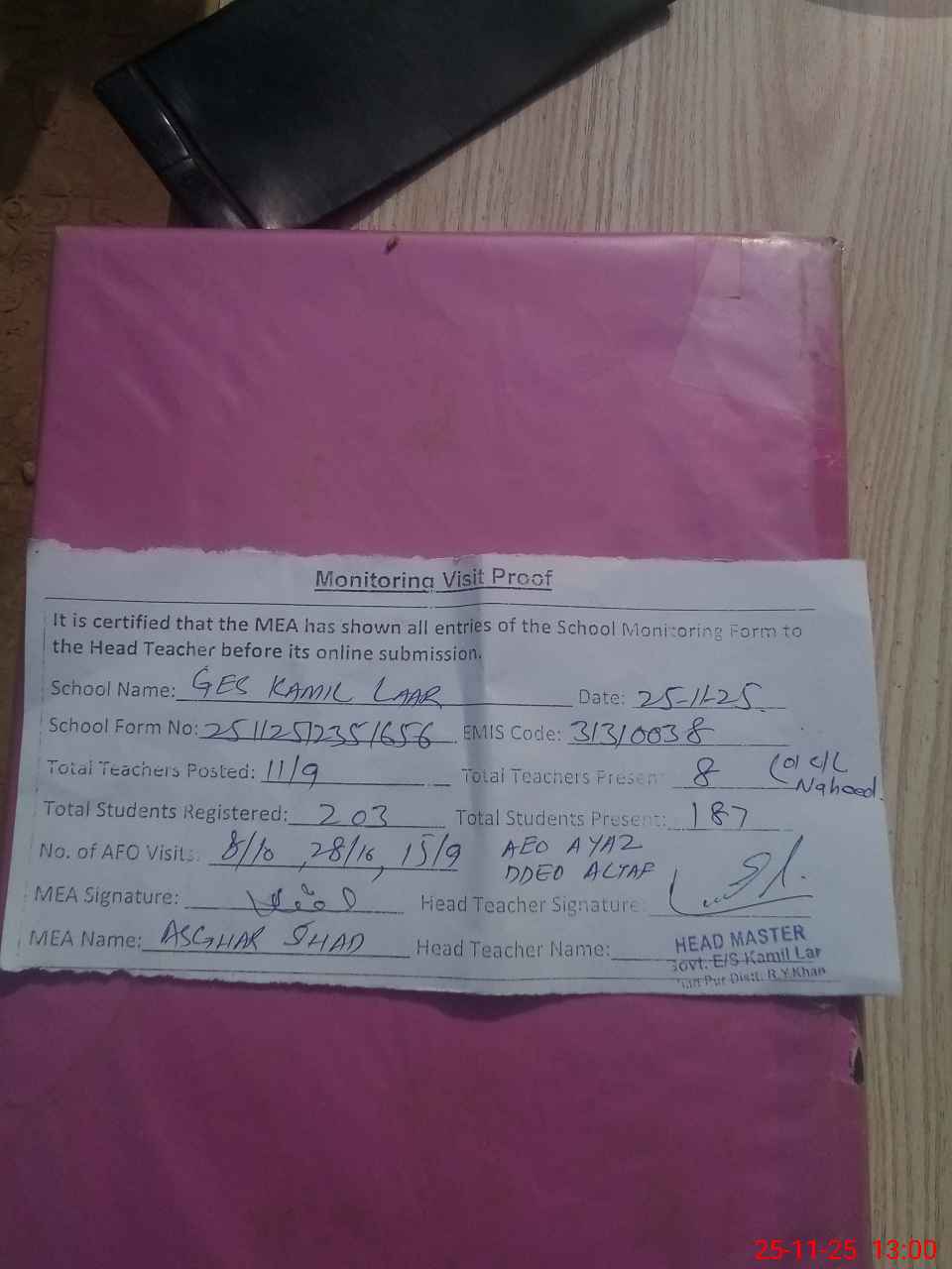 | Attendance Register | Head Teacher | MEA with School | Visit Proof |