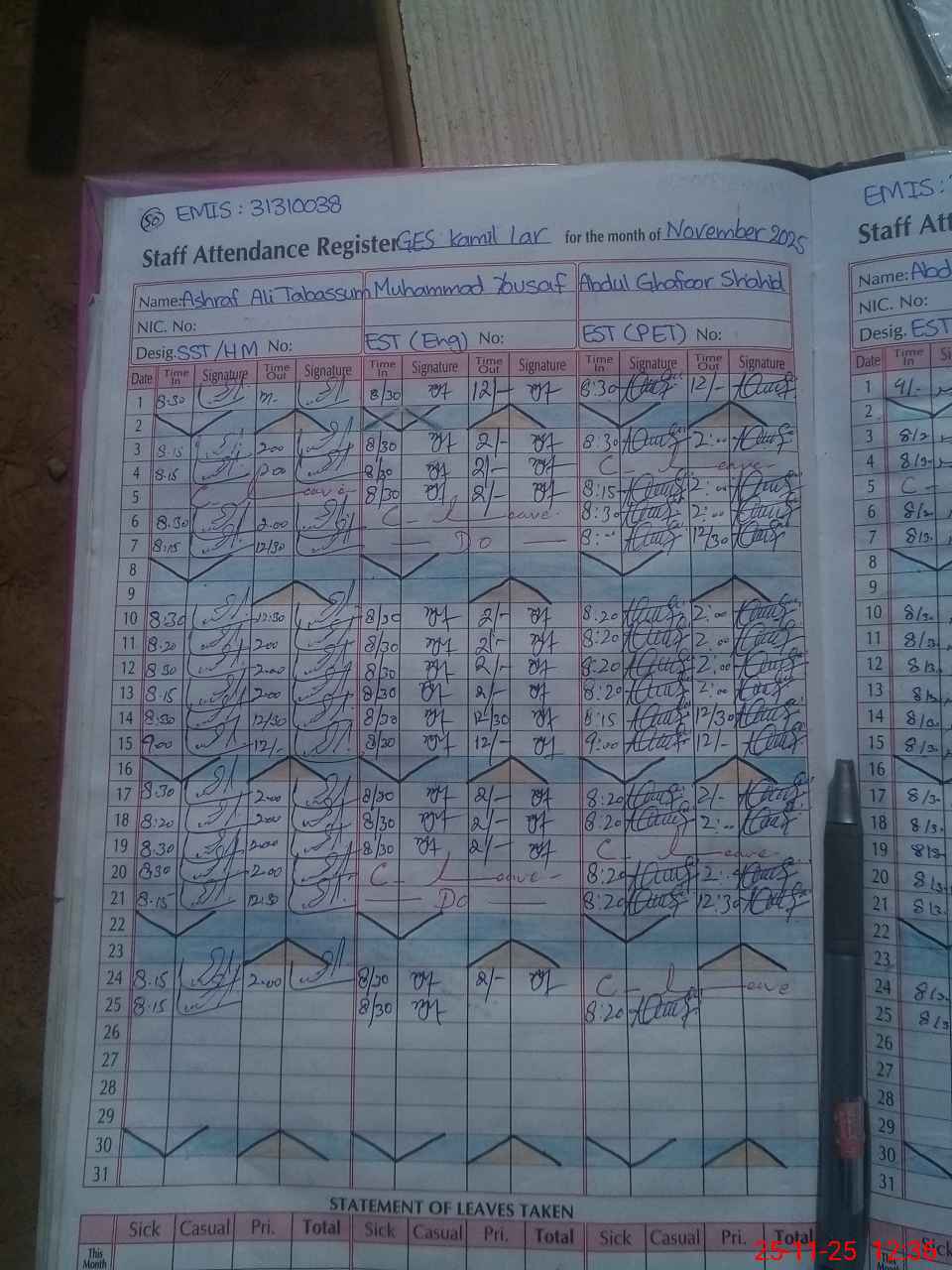 | CNIC | Full Name | Designation | R/C | Absence During Last Calender Month |