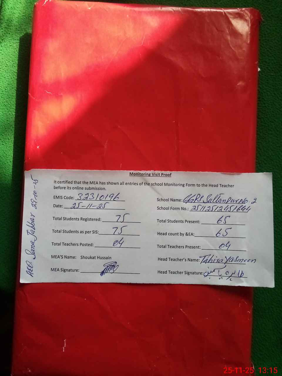 | Attendance Register | Head Teacher | MEA with School | Visit Proof |