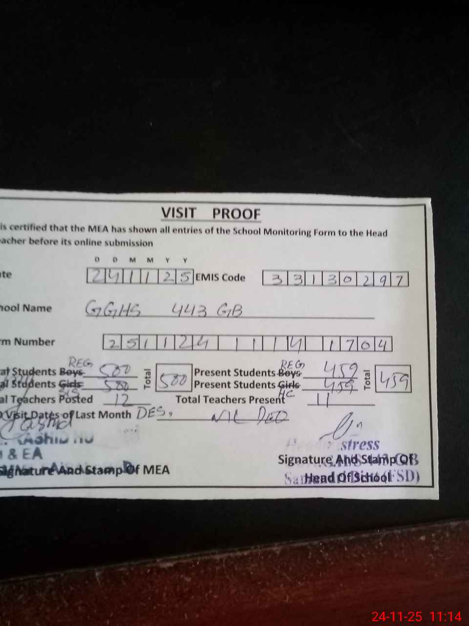 | Attendance Register | Head Teacher | MEA with School | Visit Proof |