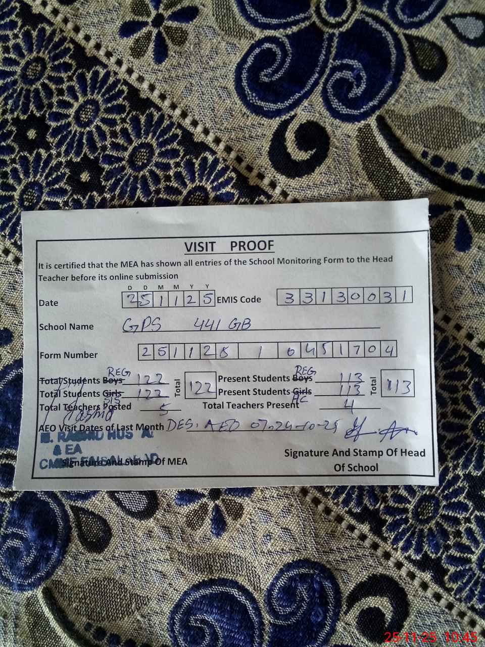 | Attendance Register | Head Teacher | MEA with School | Visit Proof |