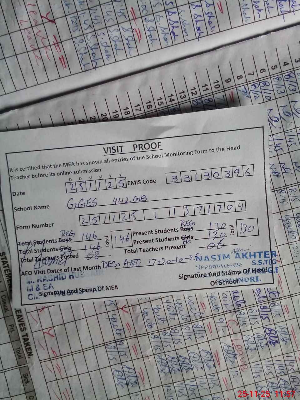 | Attendance Register | Head Teacher | MEA with School | Visit Proof |