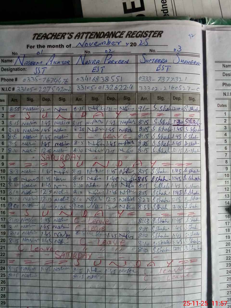 | CNIC | Full Name | Designation | R/C | Absence During Last Calender Month |