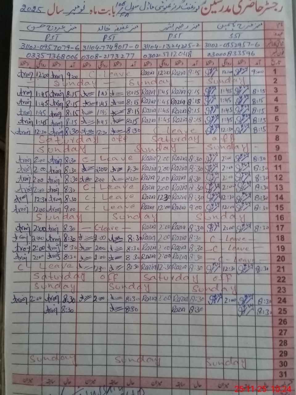 | CNIC | Full Name | Designation | R/C | Absence During Last Calender Month |