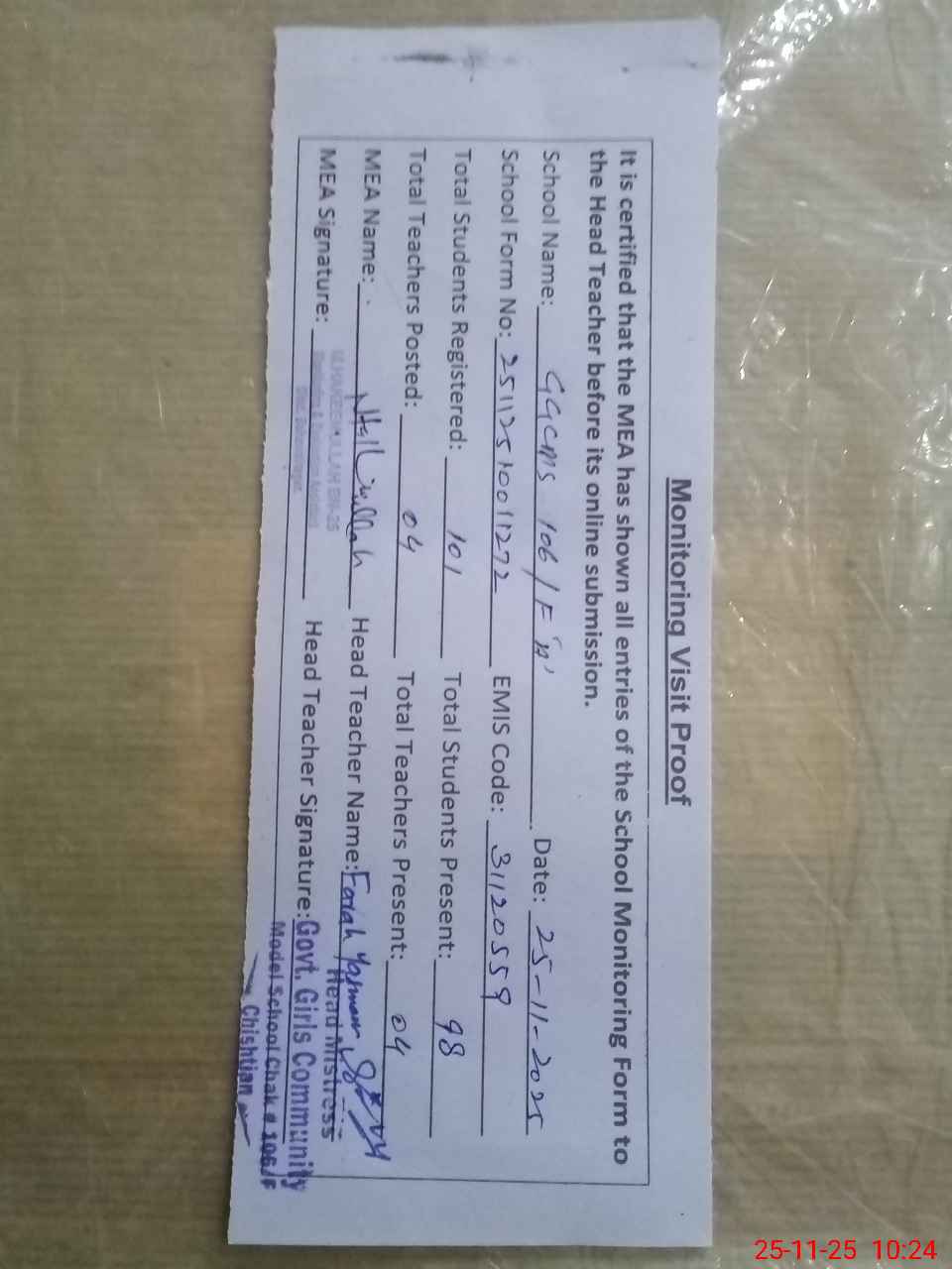 | Attendance Register | Head Teacher | MEA with School | Visit Proof |