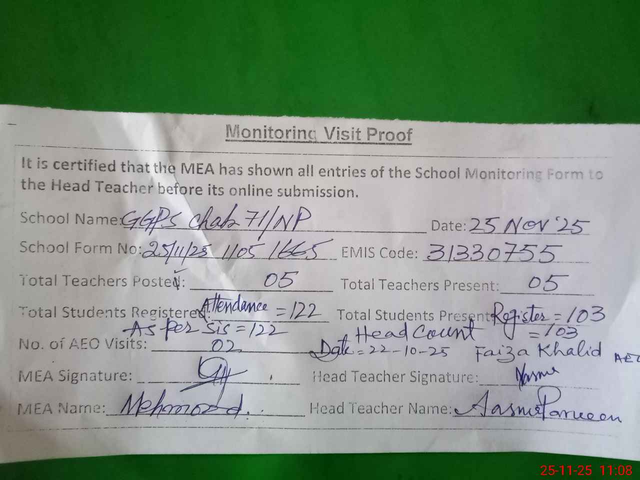 | Attendance Register | Head Teacher | MEA with School | Visit Proof |