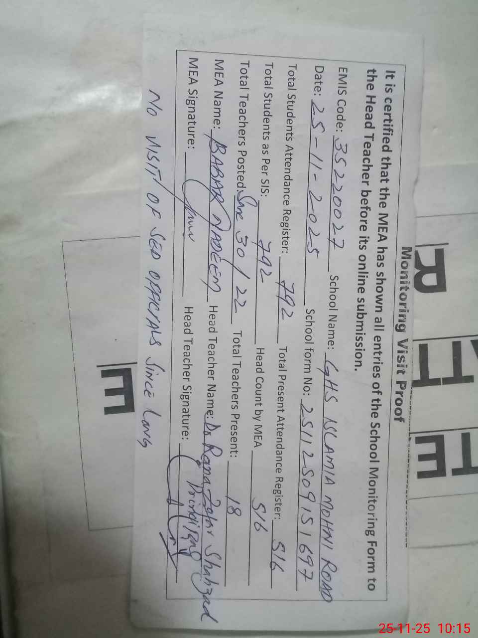 | EMIS Code: 35220027 | Name of School: GHS ISLAMIA MOHNI ROAD | |||