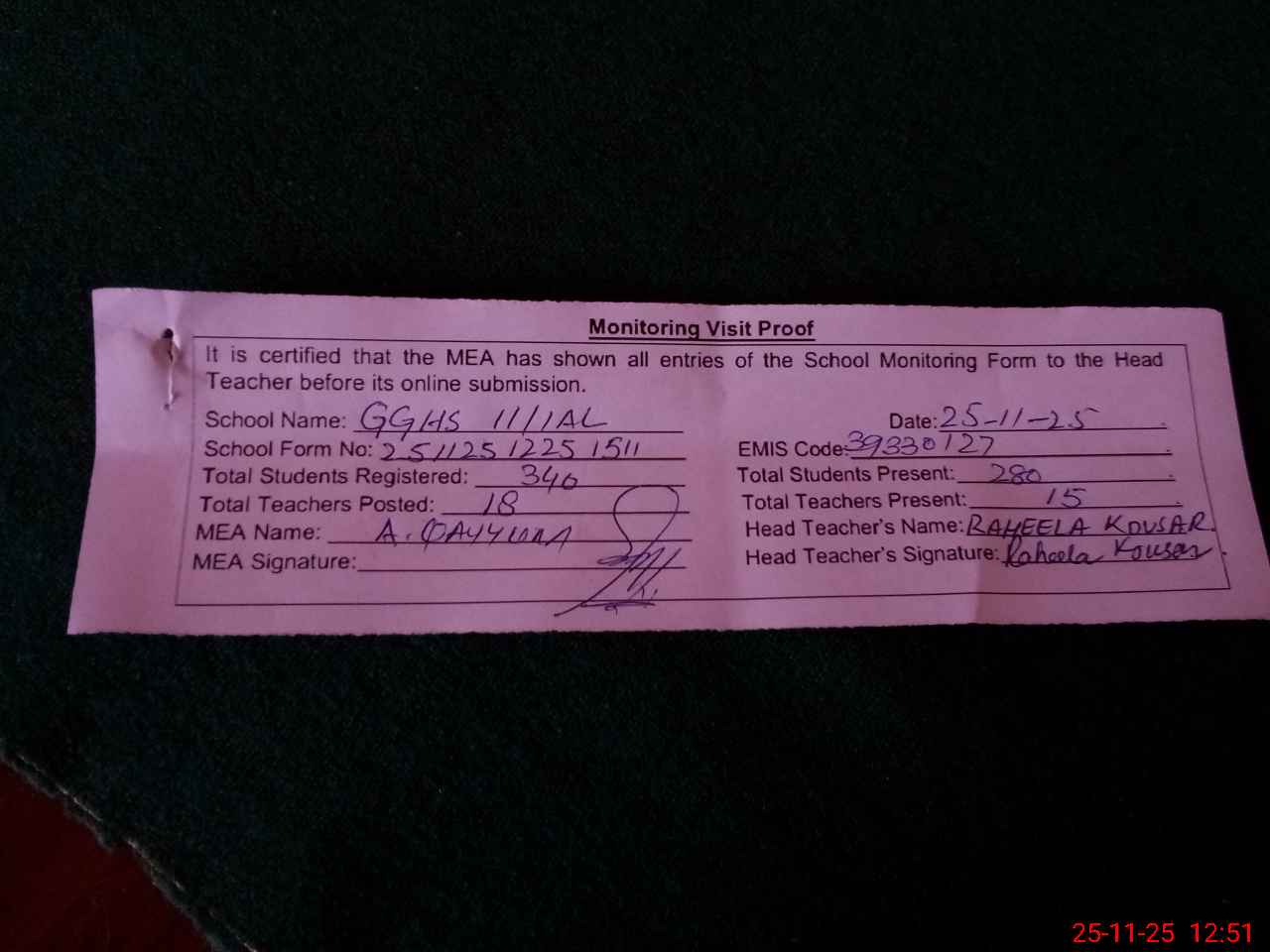 | Attendance Register | Head Teacher | MEA with School | Visit Proof |