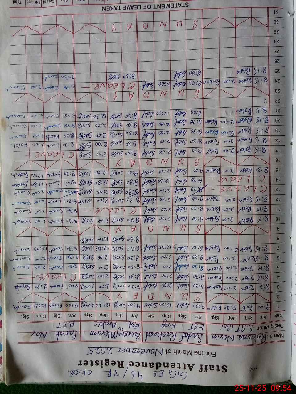 | CNIC | Full Name | Designation | R/C | Absence During Last Calender Month |