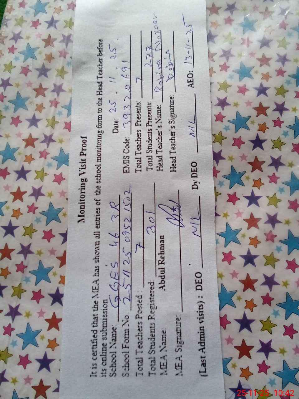 | Attendance Register | Head Teacher | MEA with School | Visit Proof |