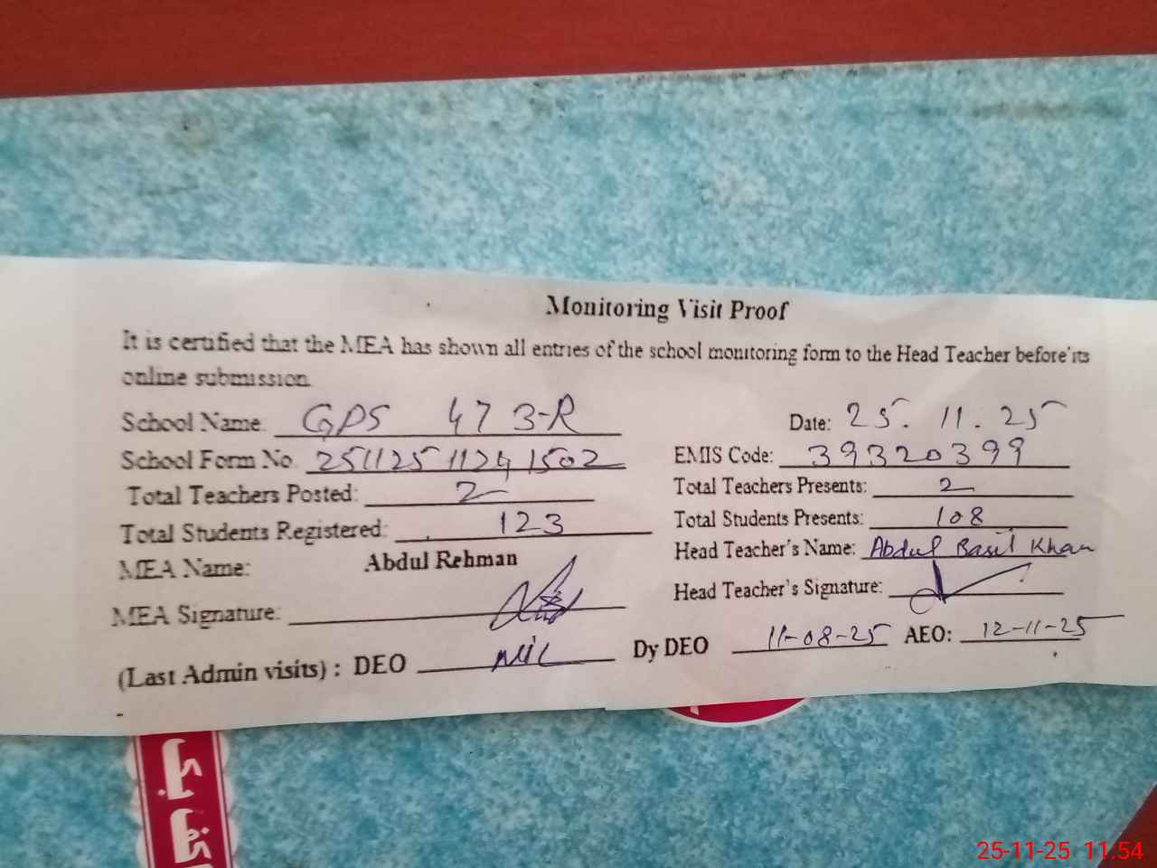 | Attendance Register | Head Teacher | MEA with School | Visit Proof |