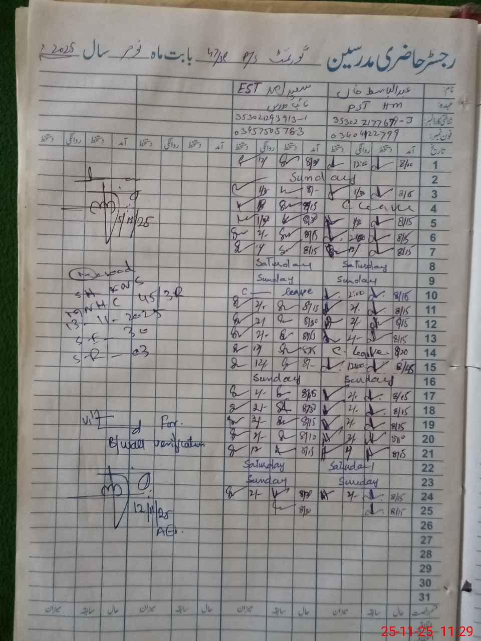 | CNIC | Full Name | Designation | R/C | Absence During Last Calender Month |