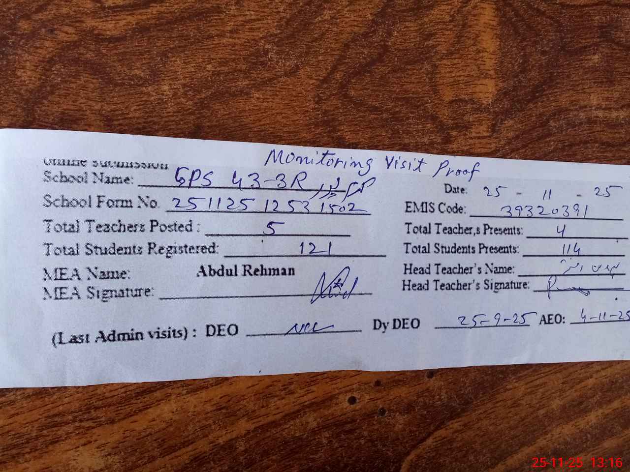 | Attendance Register | Head Teacher | MEA with School | Visit Proof |