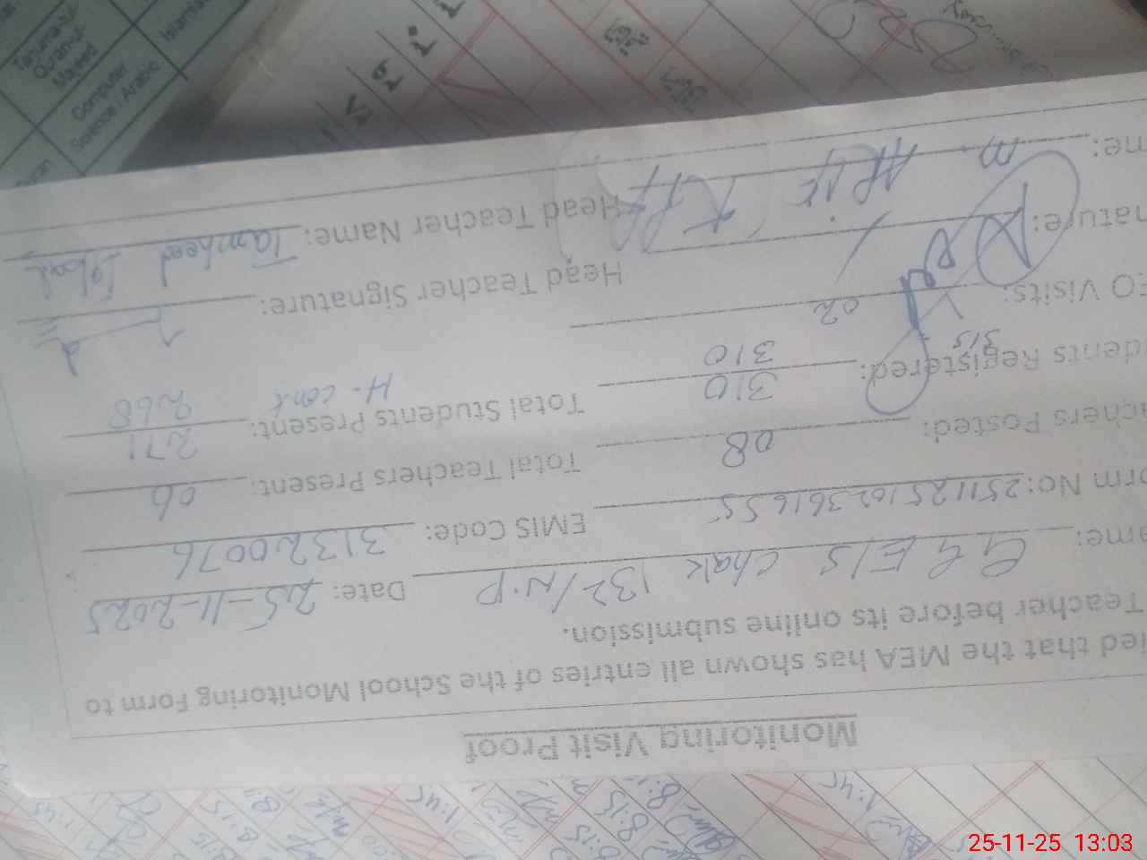 | Attendance Register | Head Teacher | MEA with School | Visit Proof |