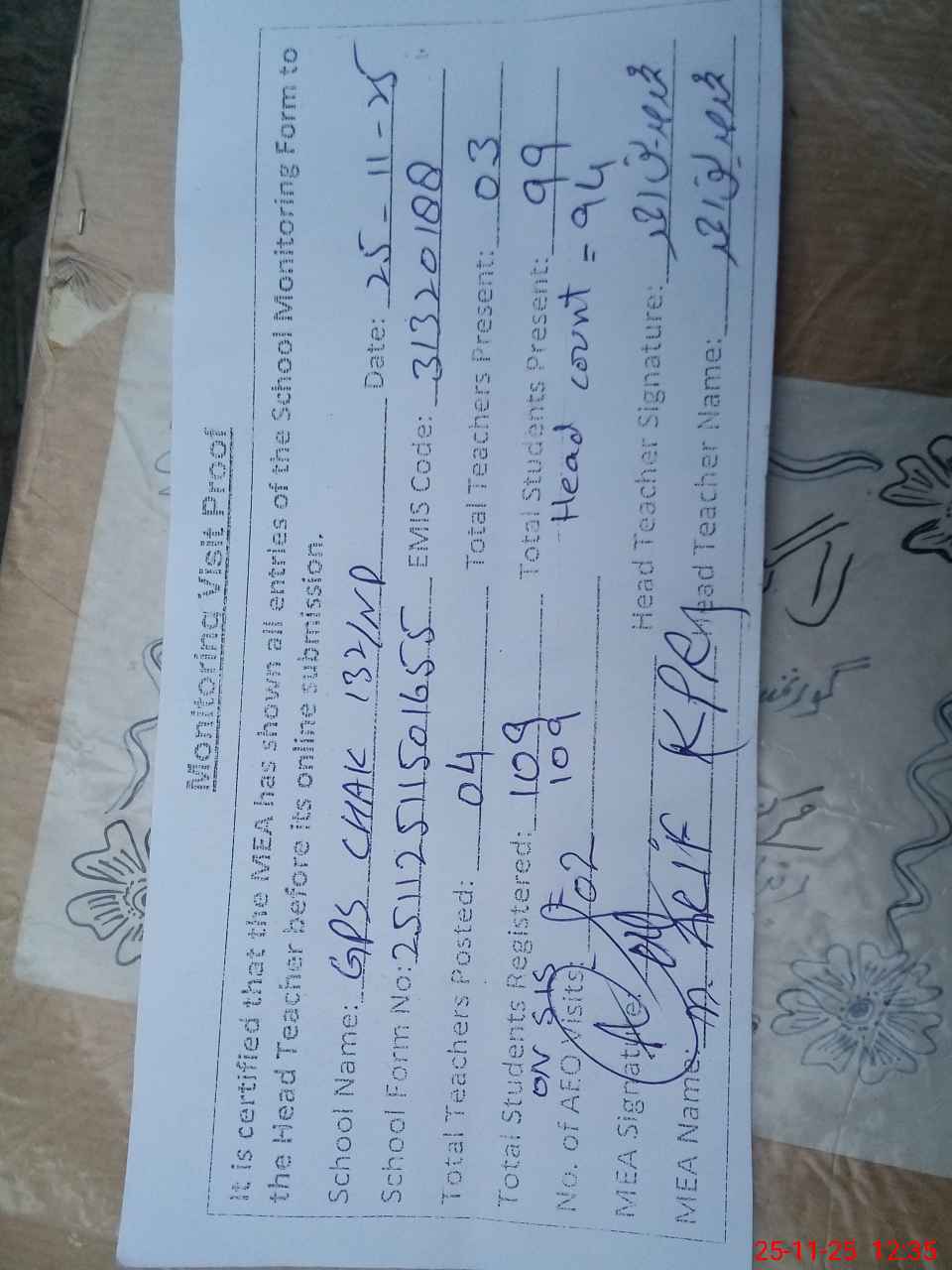 | Attendance Register | Head Teacher | MEA with School | Visit Proof |
