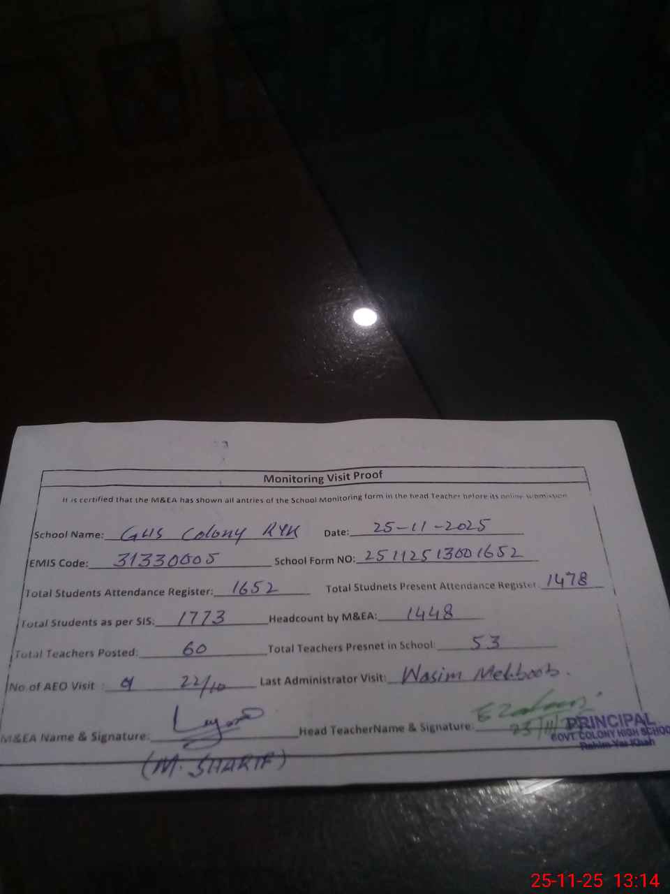 | Remarks (Use Separate Page if Required): students furniture shortage = 150 20 toilets non functional due to sewerage and cleaning issue students on SIS = 1773 students on Register= 1652 Present on Register= 1478 head Count = 1448 All numbers are different | |||||