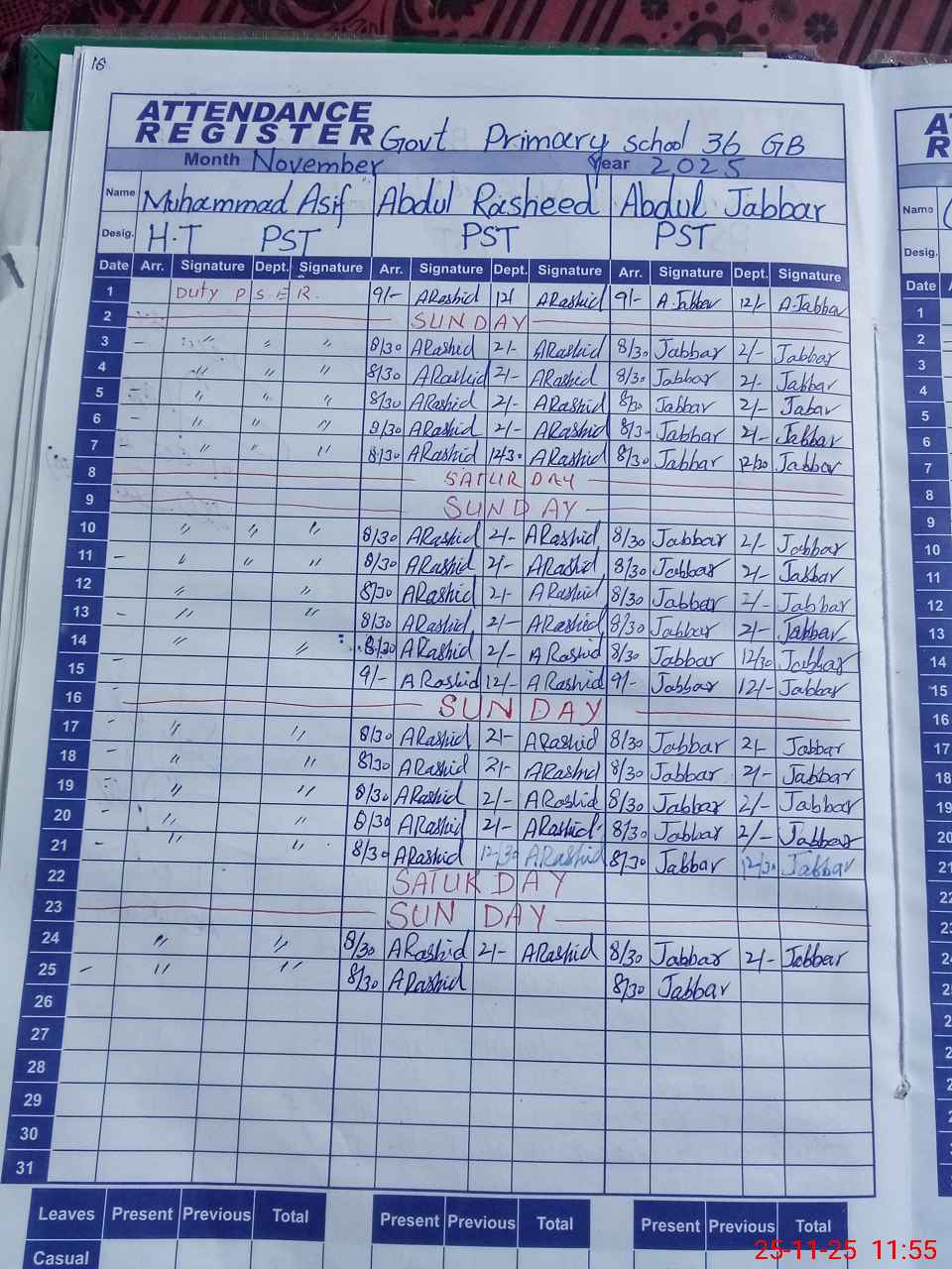 | CNIC | Full Name | Designation | R/C | Absence During Last Calender Month |