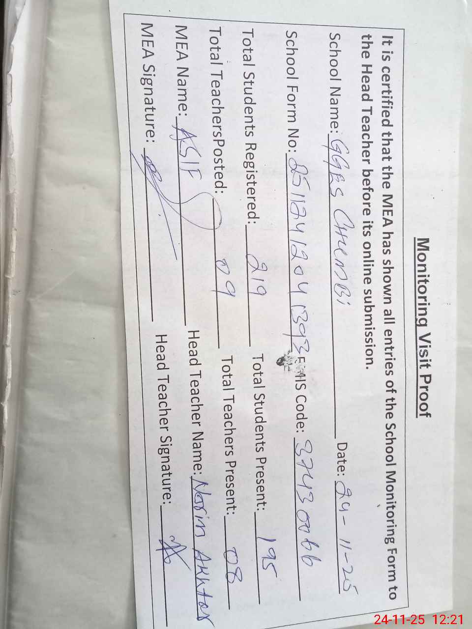 | Attendance Register | Head Teacher | MEA with School | Visit Proof |