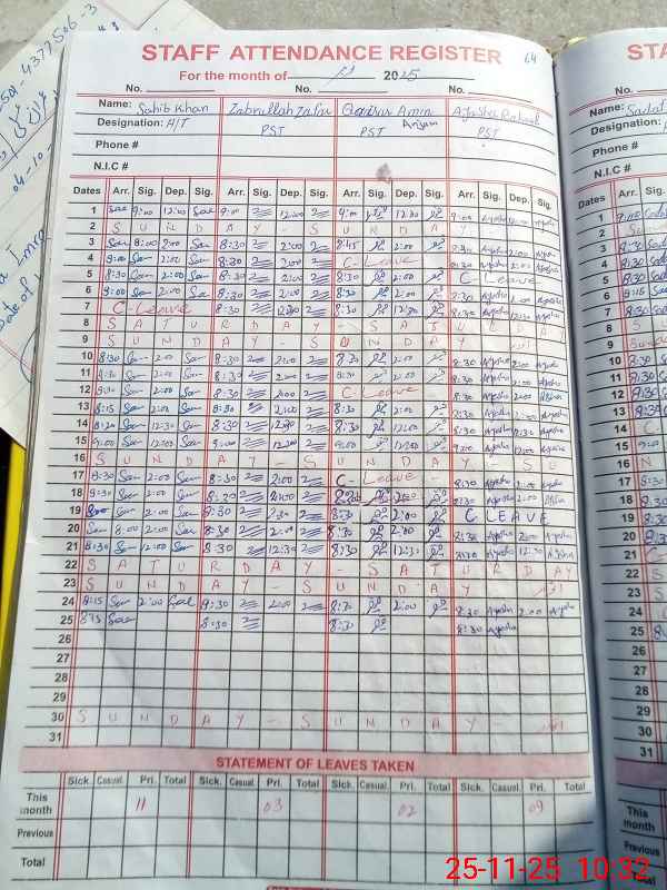 | CNIC | Full Name | Designation | R/C | Absence During Last Calender Month |