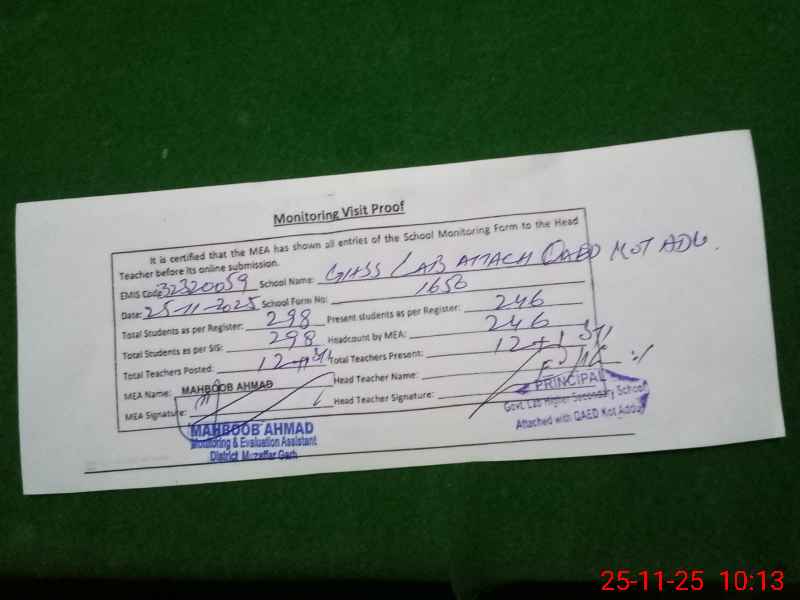 | EMIS Code: 32320059 | Name of School: GHSS Lab. (ATTACH WITH QAED) KOT ADU | |||