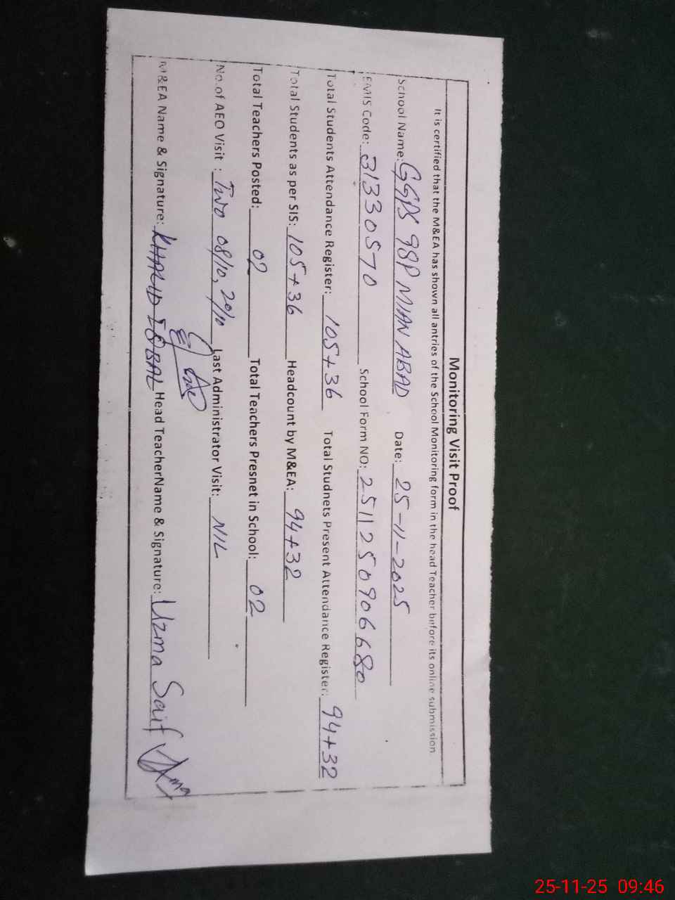 | Remarks (Use Separate Page if Required): online teacher attendance updated on sis today and school has insaf afternoon classes with students strength 36 | |||||