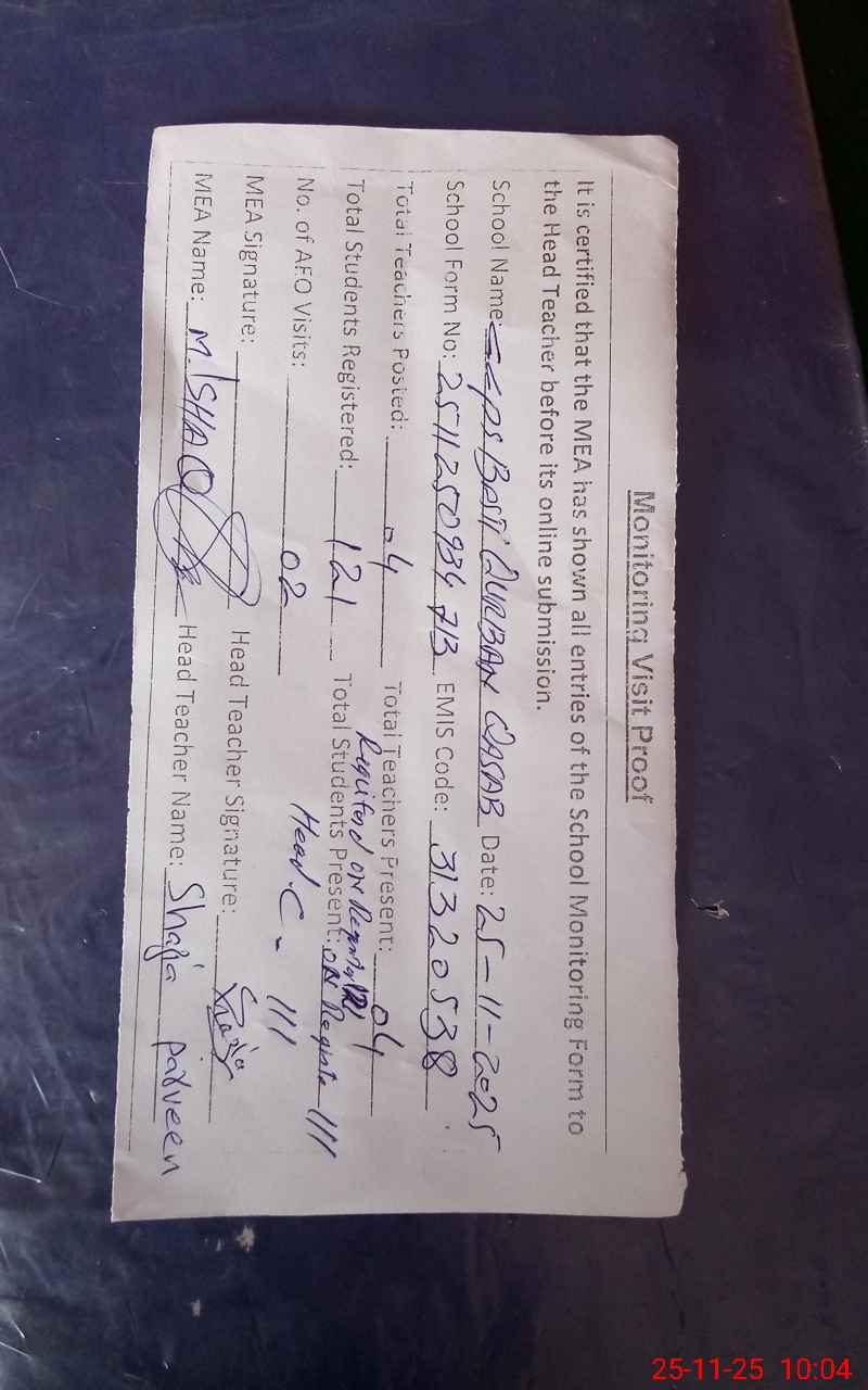 | EMIS Code: 31320538 | Name of School: GGPS BASTI QURBAN QASAB | |||