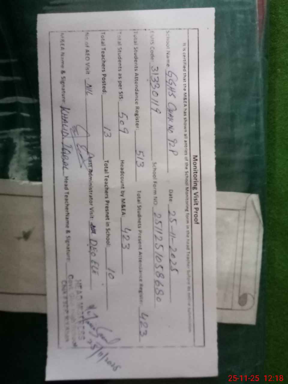 | EMIS Code: 31330119 | Name of School: GGHS CHAK NO. 92/P | |||