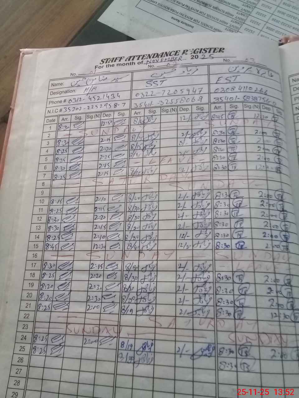 | Remarks (Use Separate Page if Required): PST sidra Afzal found absent from 29.10.2025 | |||||
