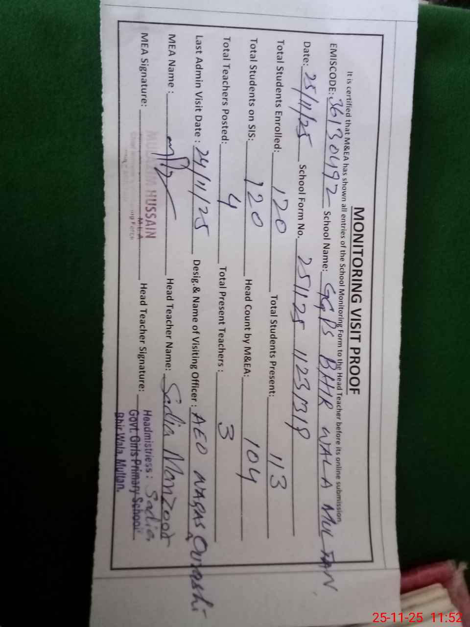 | Attendance Register | Head Teacher | MEA with School | Visit Proof |
