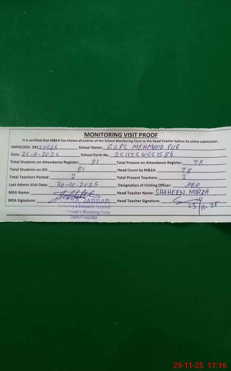 | EMIS Code: 39220565 | Name of School: GGPS MEHMOOD PUR | |||